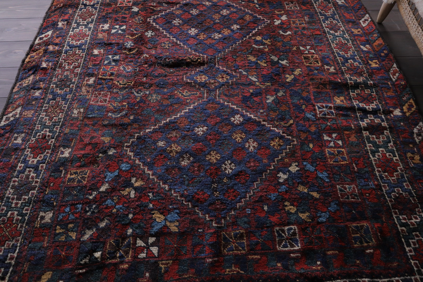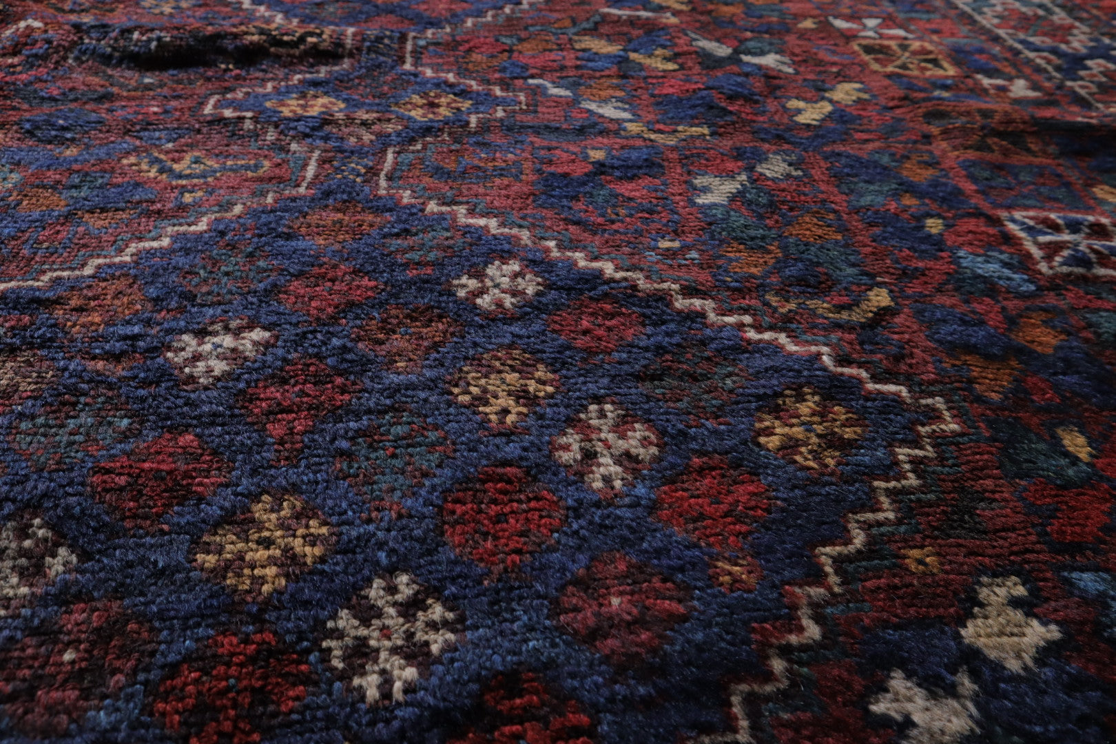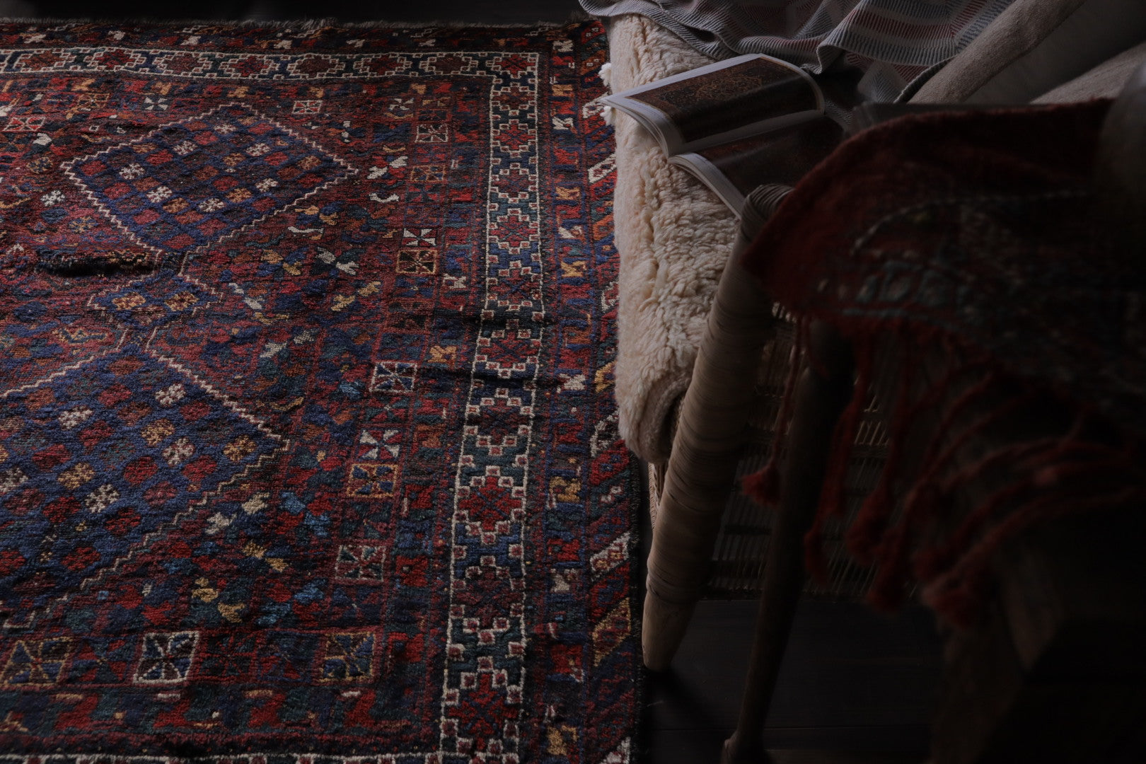 イラン南部周辺で織られた、カシュカイ族のヴィンテージラグ。深い藍・濃燕脂色・こげ茶を基調にした重厚な配色の中に、連続する大きなダイヤ型メダリオンが印象的です。メダリオンの内部には小花や幾何学の細かなモチーフがぎっしりと織り込まれ、カシュカイ族らしい素朴さと手仕事の温度を感じます。フィールド全体に散りばめられたモチーフは、光の角度で立体的に見え、アンティークの絵画のようなテクスチャーを作り出しています。また、ボーダーにも多彩な幾何学模様が連なり、ラグ全体を引き締めながら複雑で豊かな表情を生み出しています。