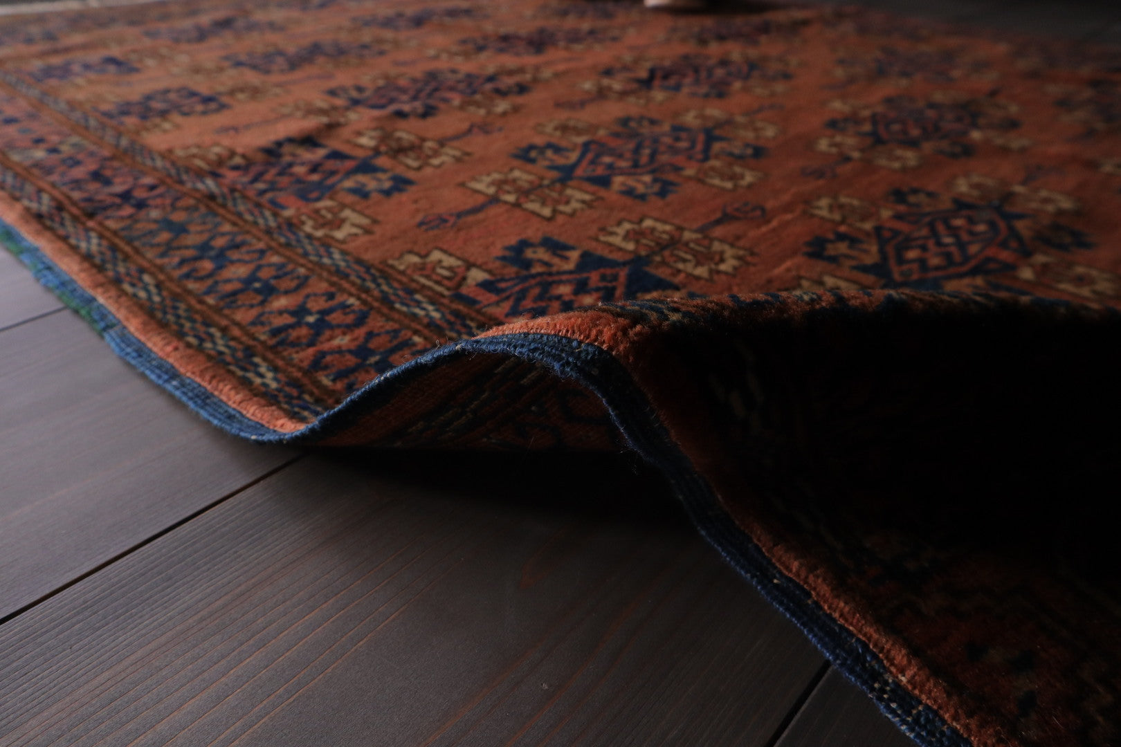 アフガニスタン北部(トルクメン族)で織られた、ヴィンテージのトライバルラグ。赤茶(レンガ色)を基調に、トルクメン族特有のギュル(部族紋章)が規則正しく並ぶ、力強くも整ったデザインが魅力です。中央に織り込まれたギュルは部族のアイデンティティを象徴し、守護や繁栄の意味が込められています。落ち着きのある赤褐色に、ネイビーやダークブラウンのアクセントが加わり、深みのあるクラシックな雰囲気を纏う一枚です。端には幾何学的なモチーフが密に織り込まれ、ボーダー全体が空間をしっかり引き締めてくれます。ヴィンテージらしい風合いと均整のとれたデザインが、現代インテリアとの相性も抜群です。