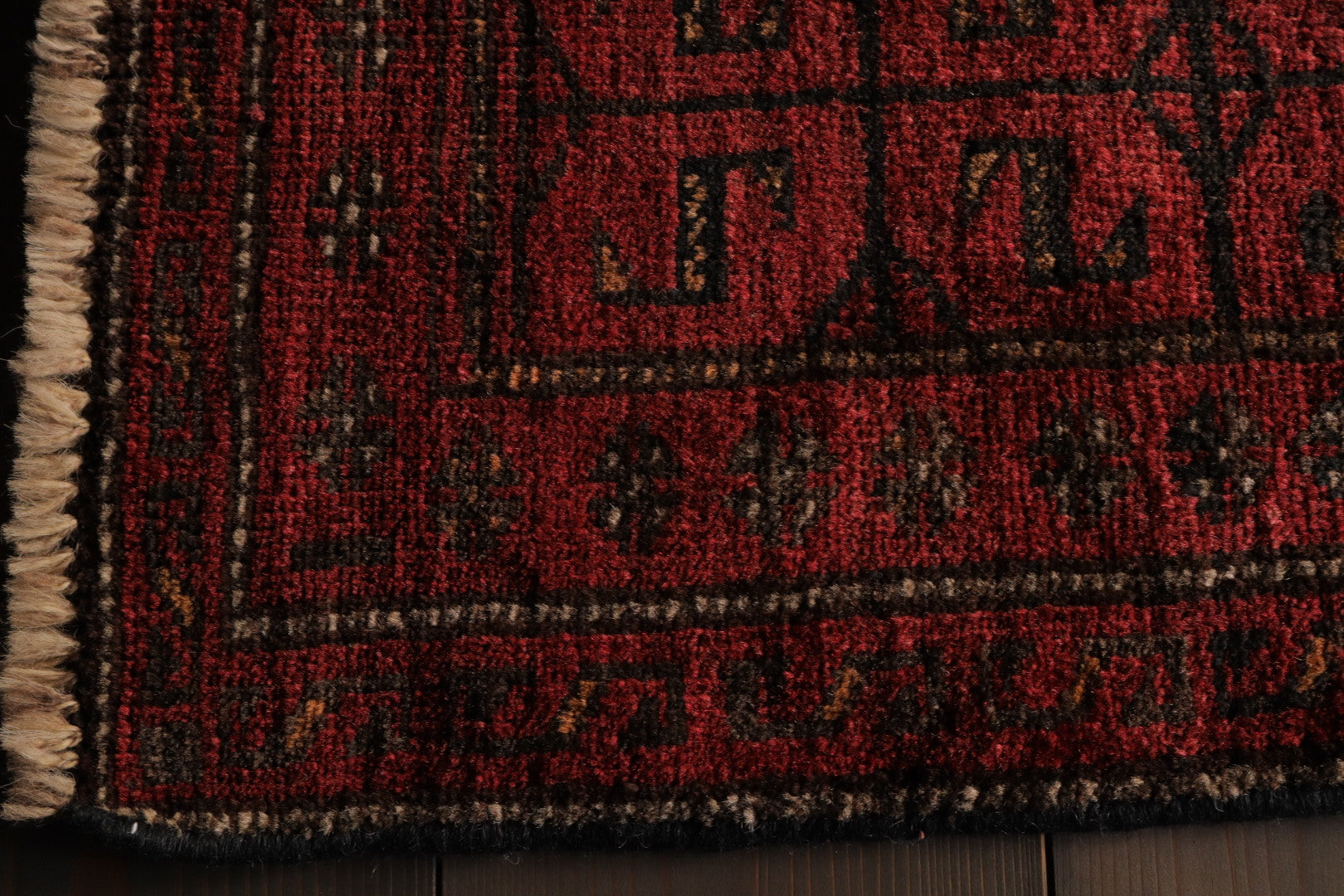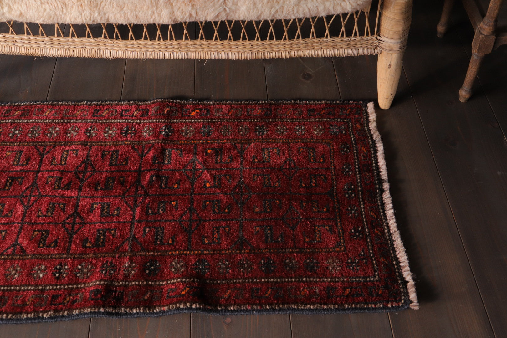 深紅のフィールドに、小さく連なる幾何学モチーフが規則的に並ぶ、静かな存在感を持つヴィンテージラグ。黒や深緑、くすんだオレンジがアクセントとして散りばめられ、落ち着いた赤の中に溶け込んでいます。使い込まれたウールはしっとりと手に馴染み、踏み心地は柔らかいです。玄関やソファー前にお勧めのサイズ感。