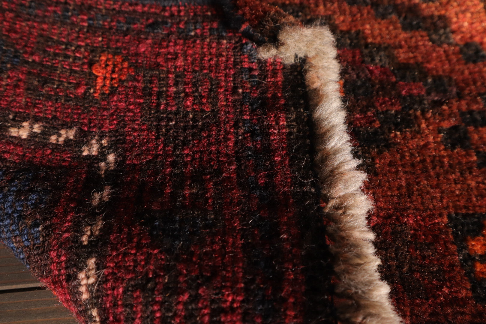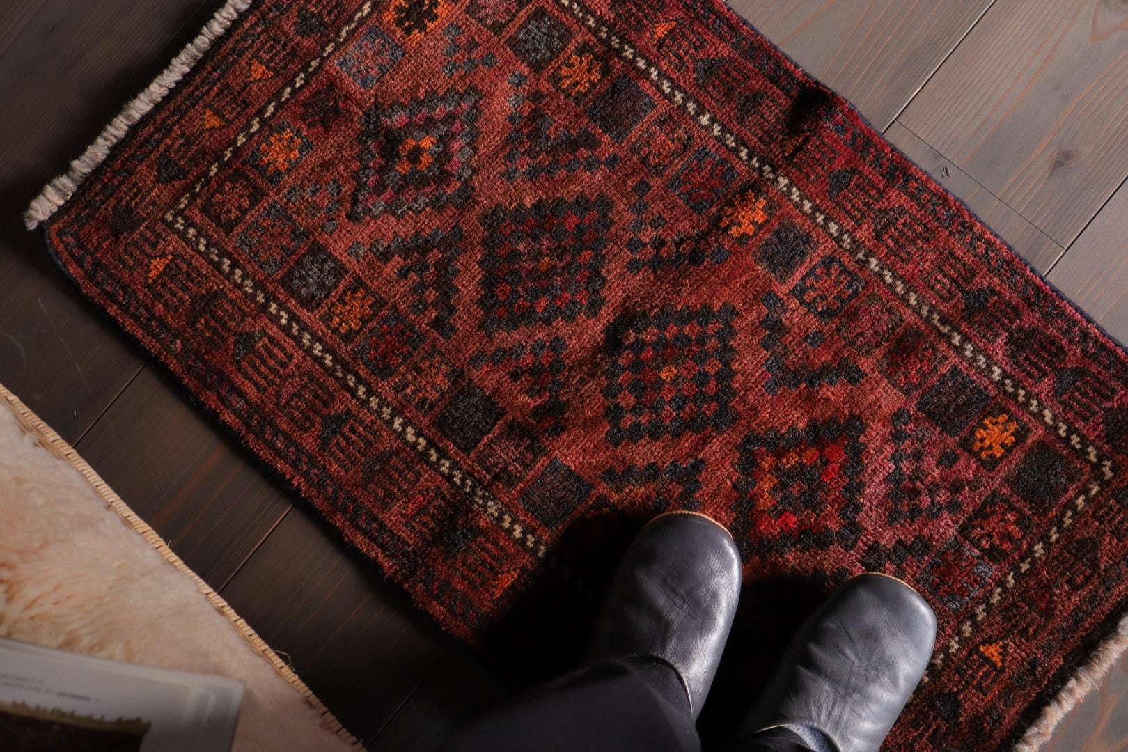 淡い燕脂色をベースに、くすみブルー・こげ茶・ダークオレンジが複雑に溶け合うヴィンテージラグ。細かな幾何学文様はすべて手仕事によるもので、均一ではない表情が、長い年月を経た織物だけが持つ温かさと奥行きを感じさせます。中央には連なるダイヤ模様が並び、周囲をぐるりと囲む細密なボーダーが一枚としての存在感を強めています。派手さはなく、落ち着いたトーンでまとめられている。空間に深みをくれる一枚です。