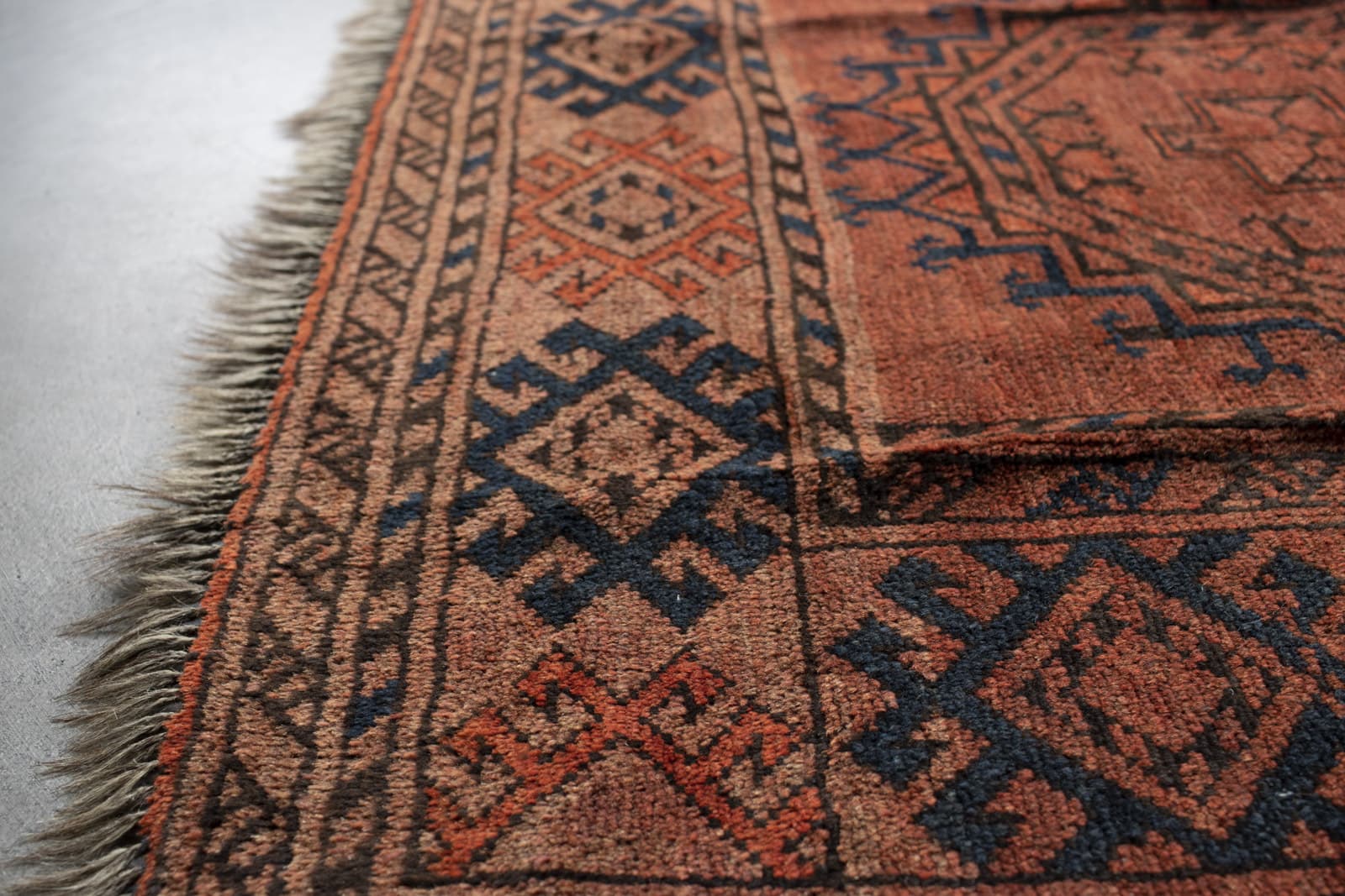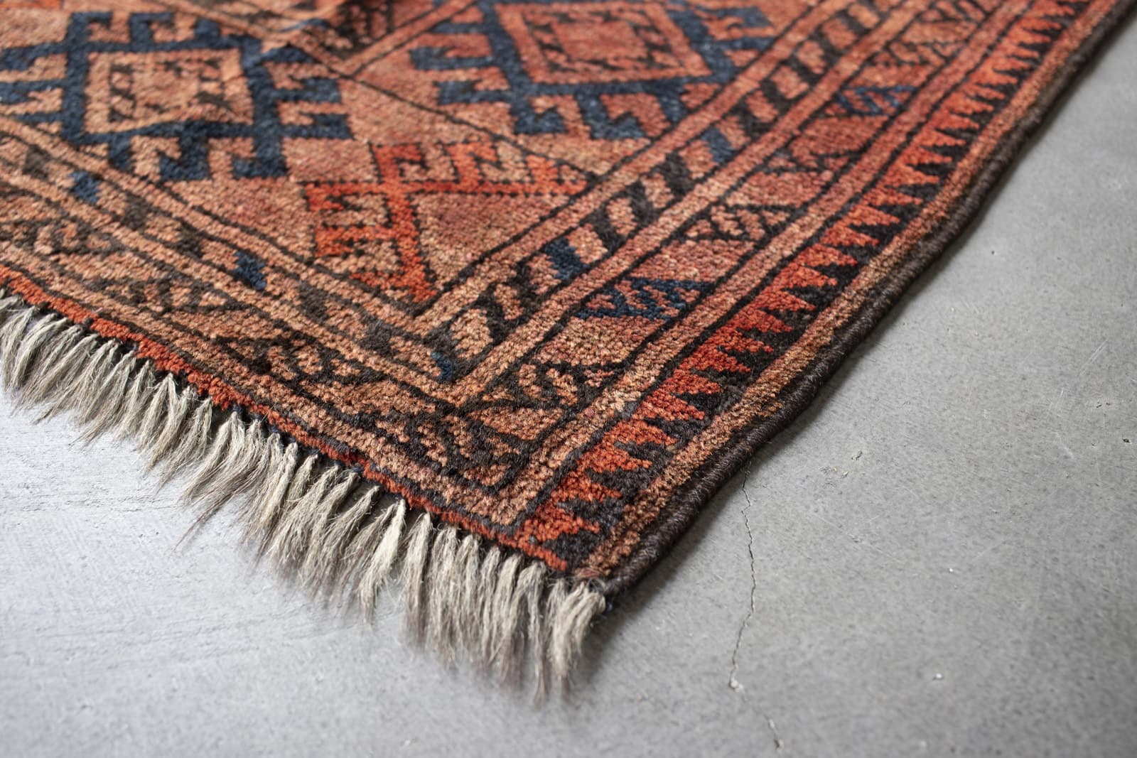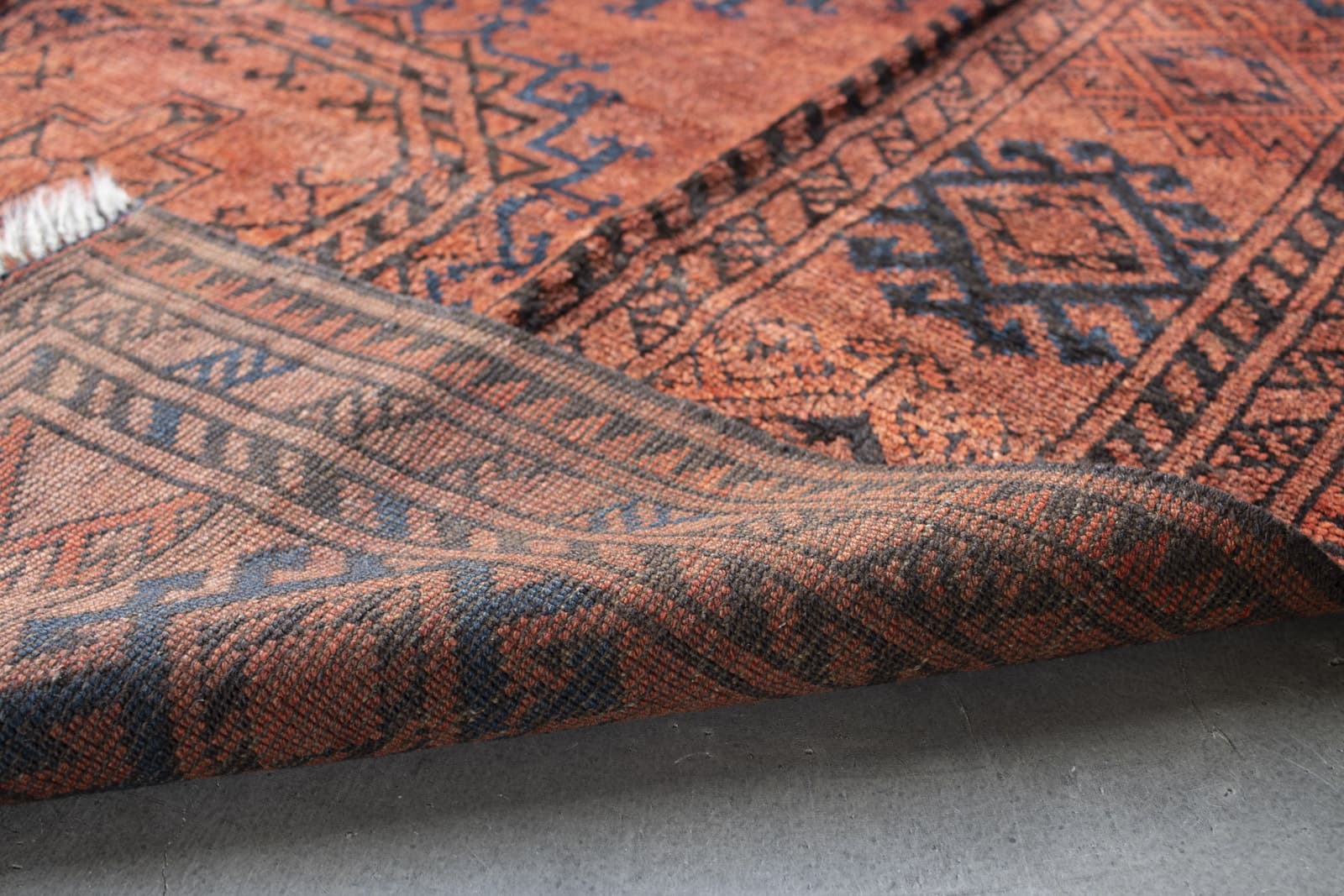 そこにネイビーとブラウンで描かれた紋様が美しいトルクメンラグ。少しづつ中央のデザインも違い、織り手の心が垣間見えるそんなところも魅力的な一枚。