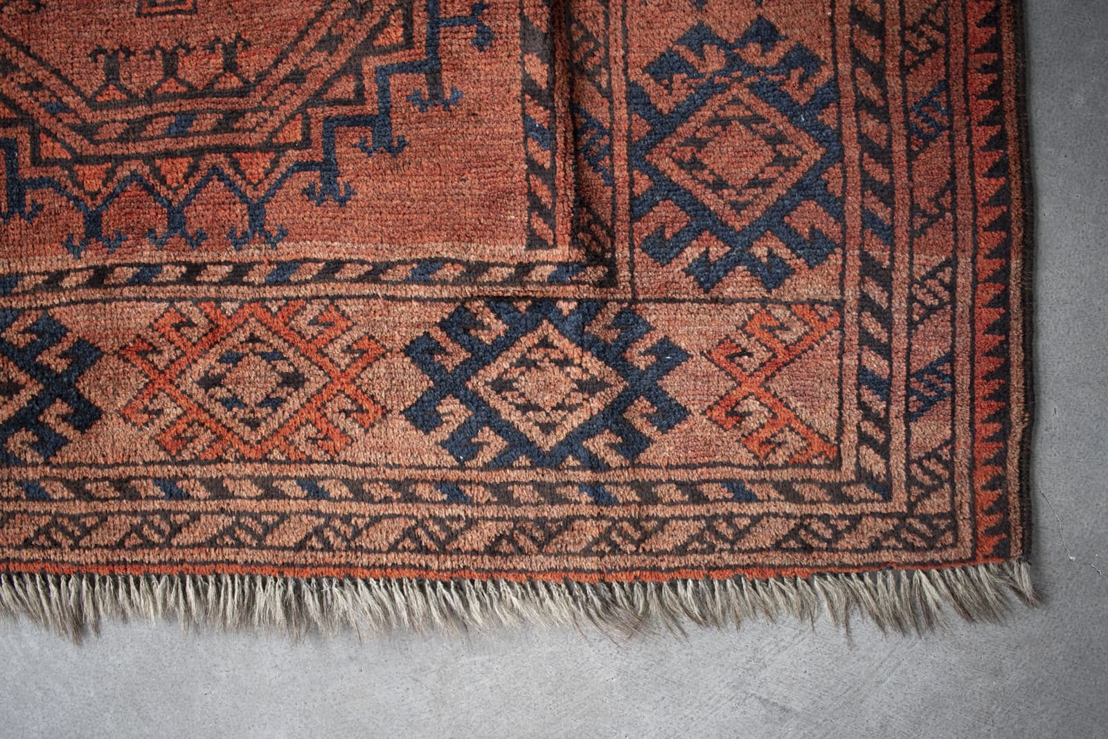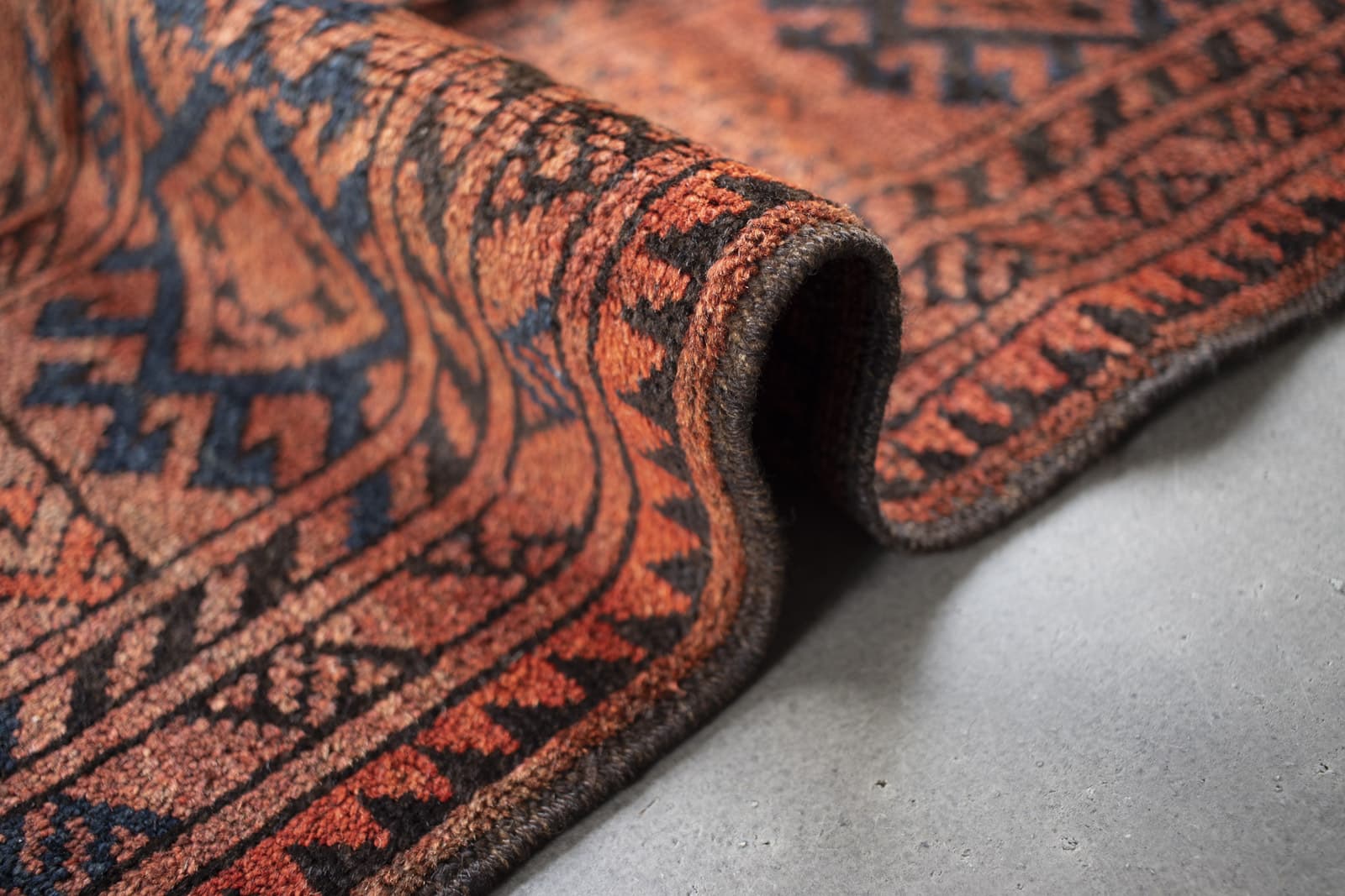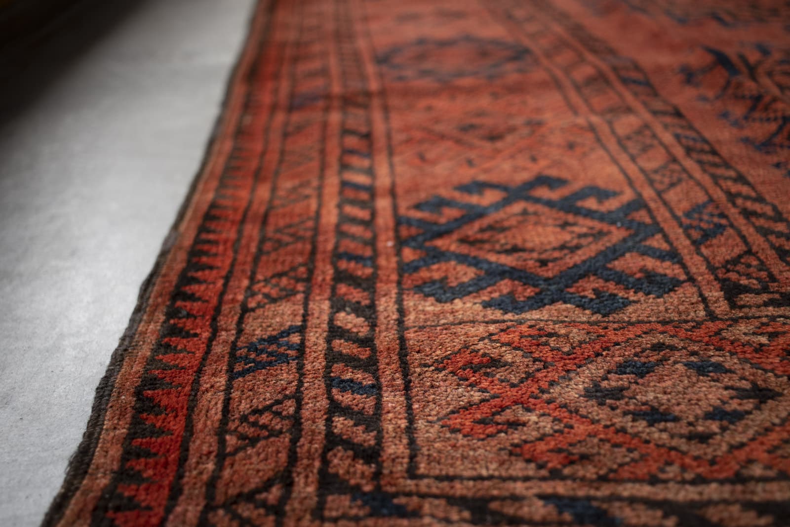 そこにネイビーとブラウンで描かれた紋様が美しいトルクメンラグ。少しづつ中央のデザインも違い、織り手の心が垣間見えるそんなところも魅力的な一枚。