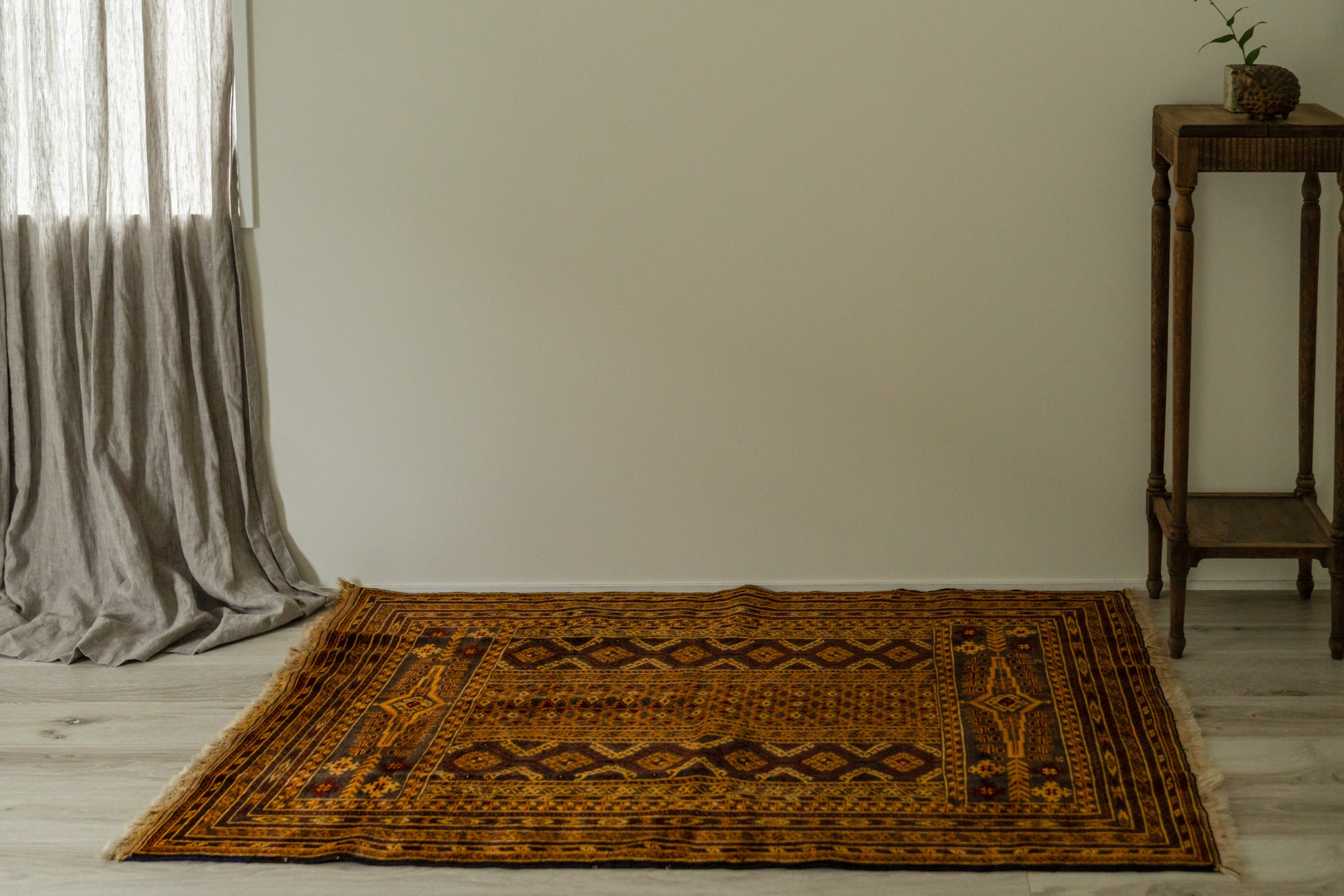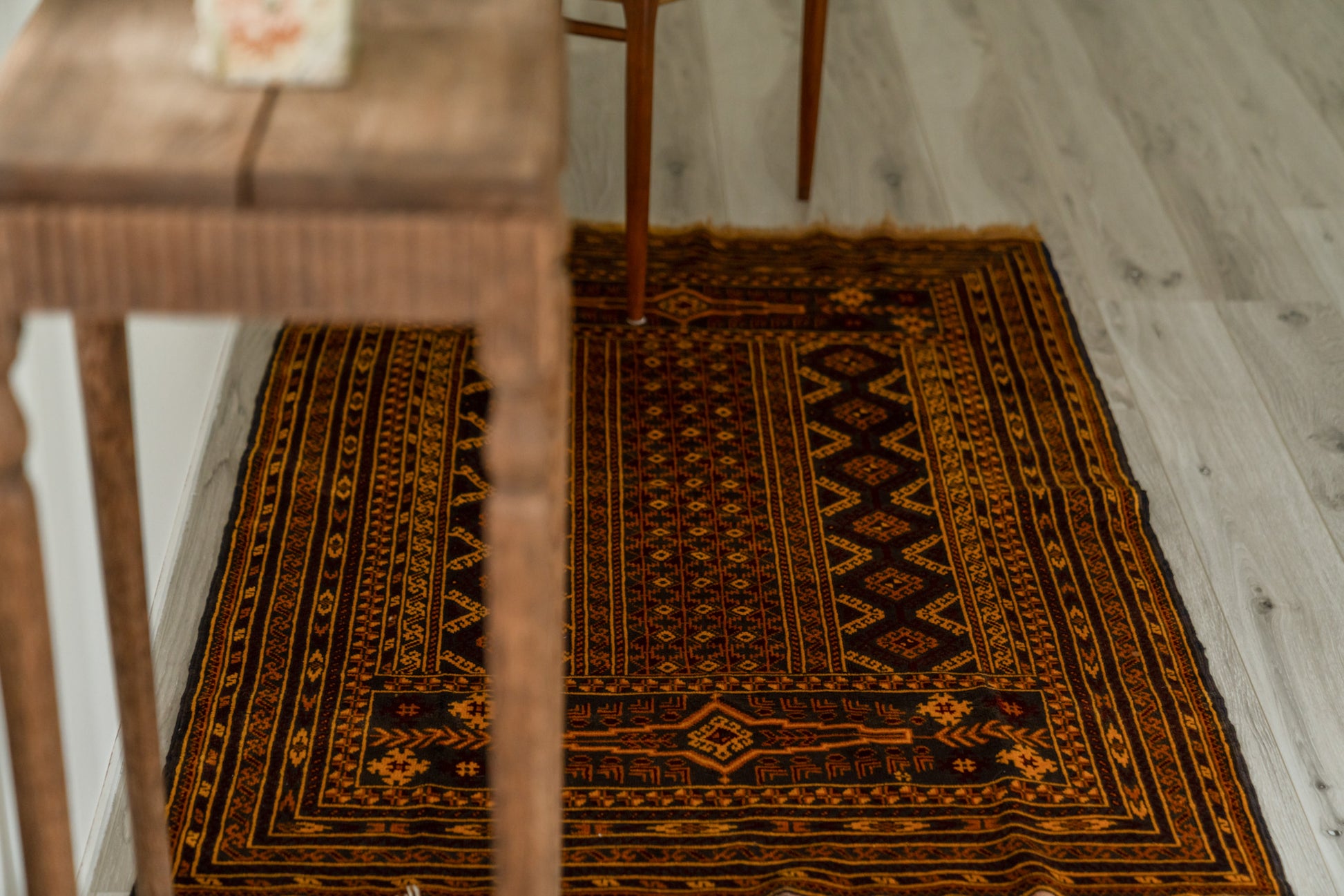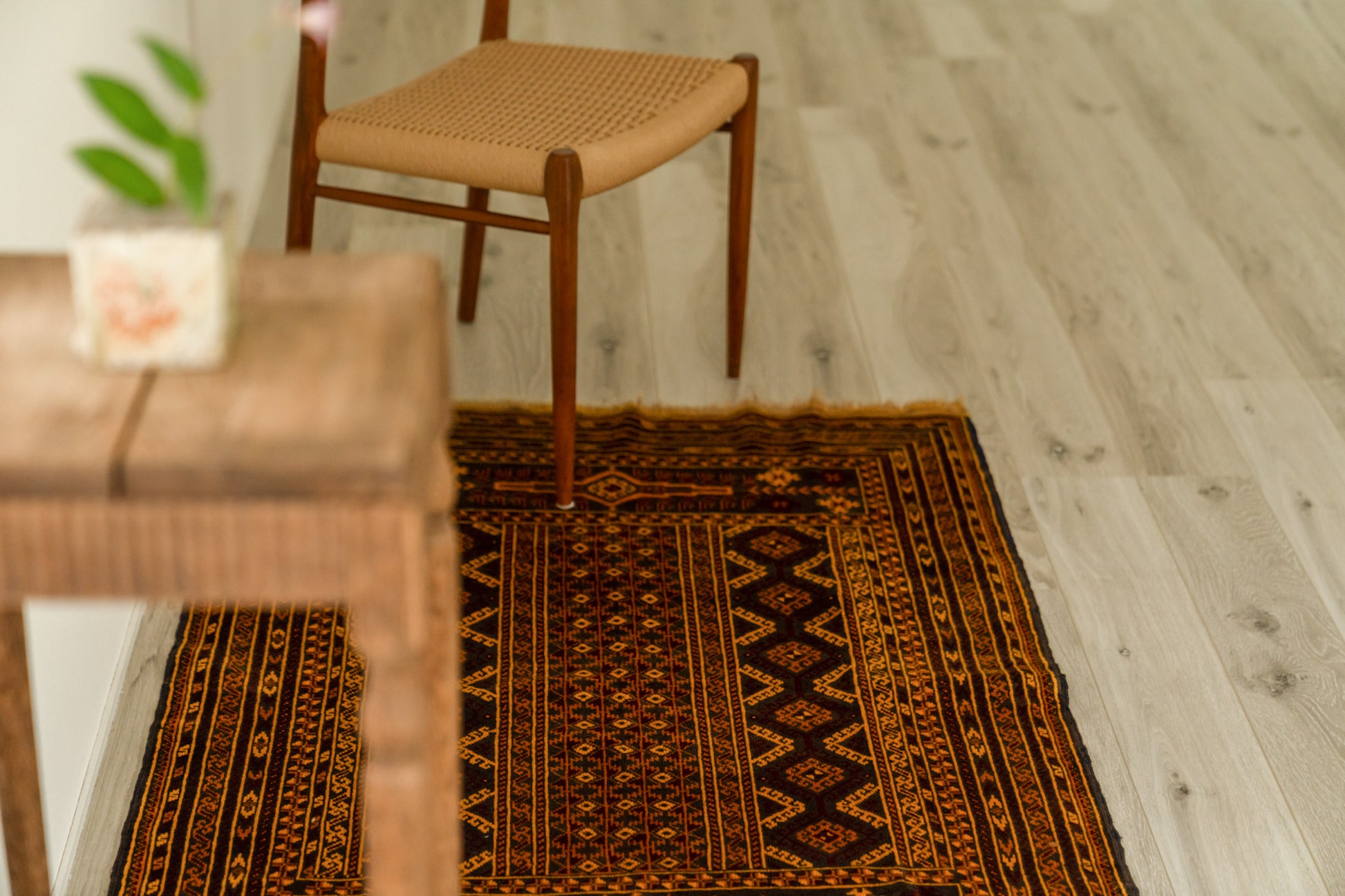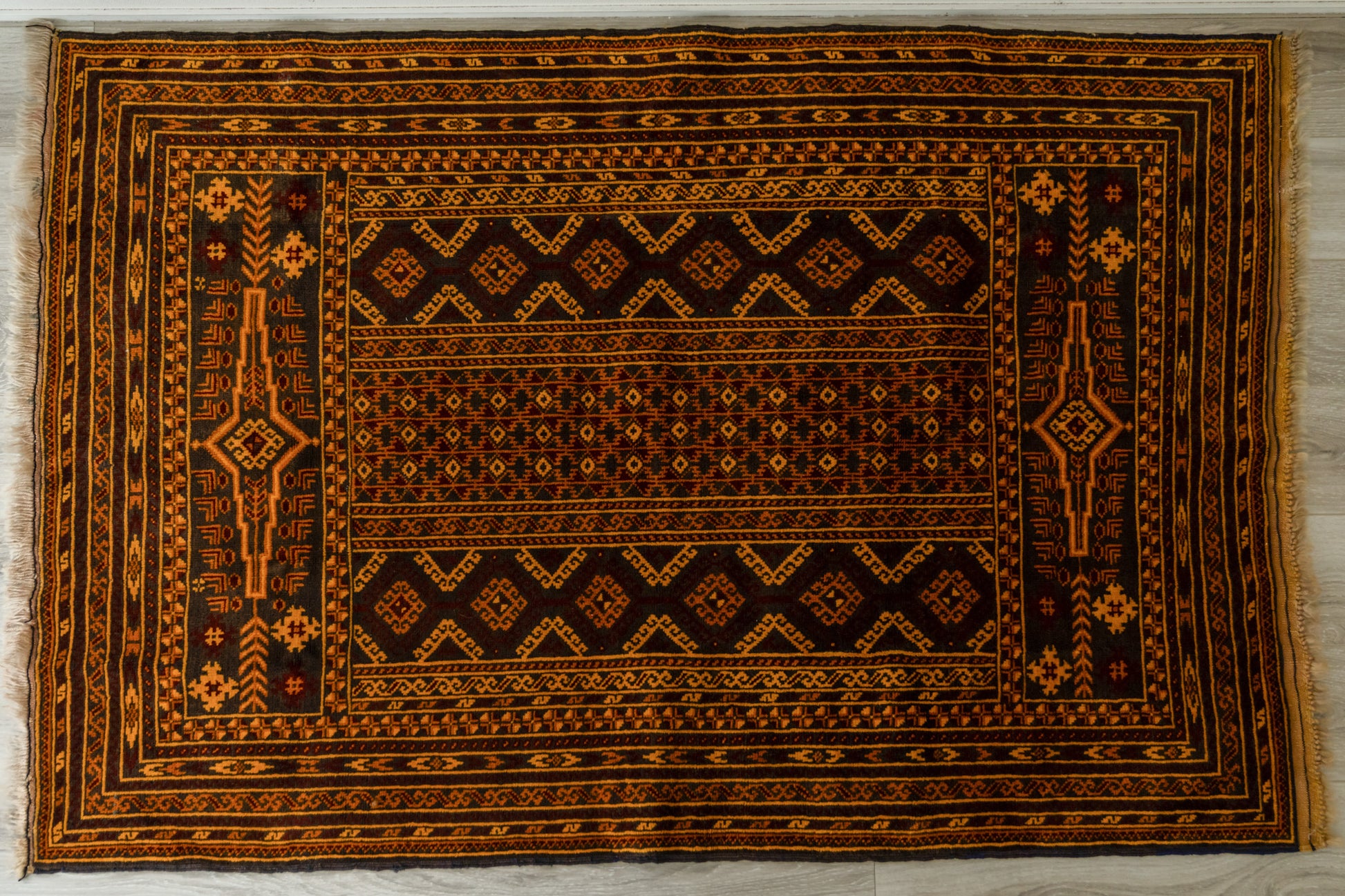 【商品説明】しっとりとしなやかな質感のアフガニスタン西部アリクホジャのラグ、ブルーグレーのような珍しいベースカラーにオレンジと黄色の中間色とえんじ色が全体のデザインを構成していて、とてもクールでカッコイイ一枚です。どんなスタイルの空間にも存在感を残しながらも、馴染んでしまう優秀なラグです。