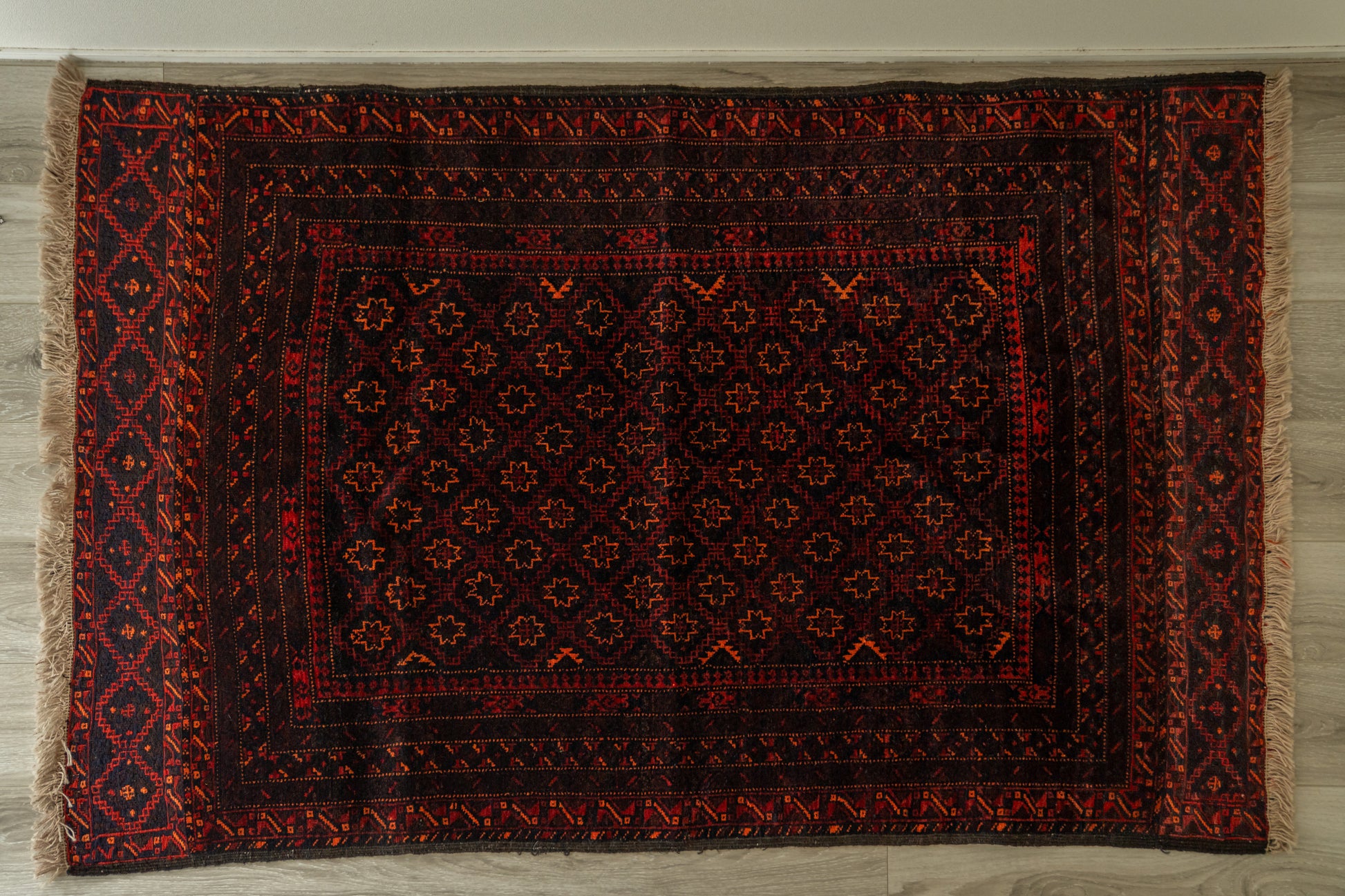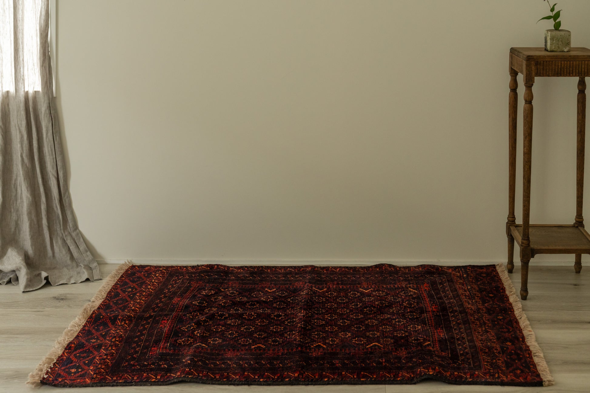 【商品説明】落ち着いたシックな色使いを得意とするアフガニスタン西部バルーチ族のラグ。サイドの幅広いキリムエンドがこのラグの特別感を感じさせてくれます。とてもクールでカッコイイ一枚です。こちらもどのスタイルの空間にも馴染んでしまう優秀なラグ。コンパクトなサイズ感は、色んな場所に敷き変えられる楽しみがあります。