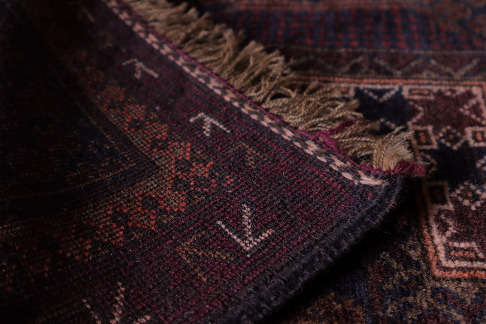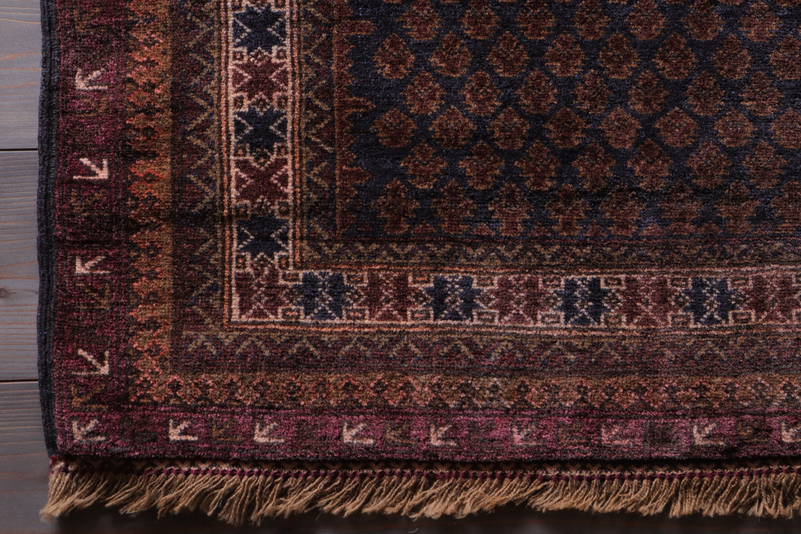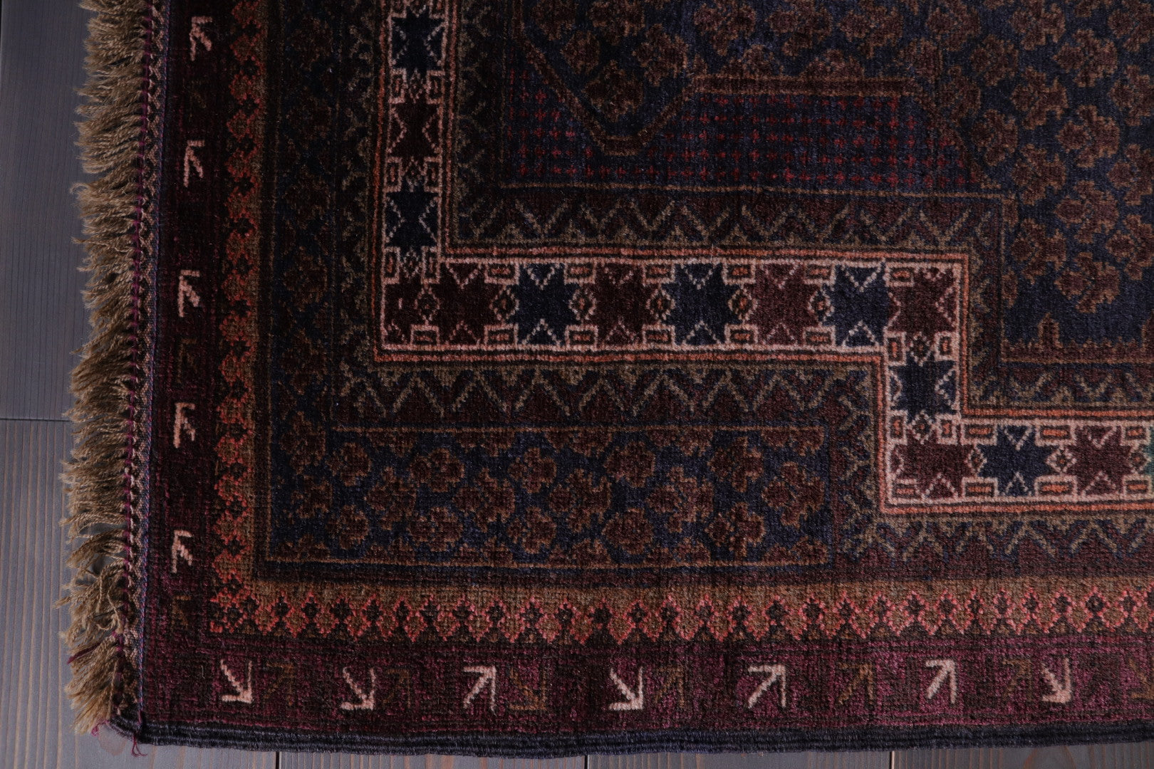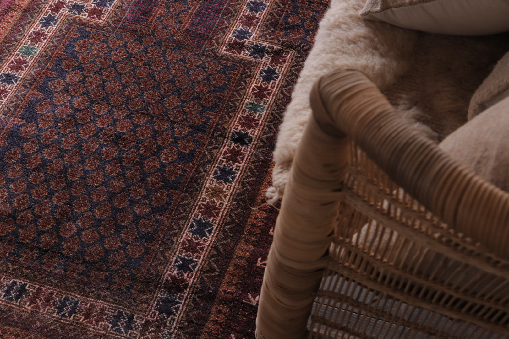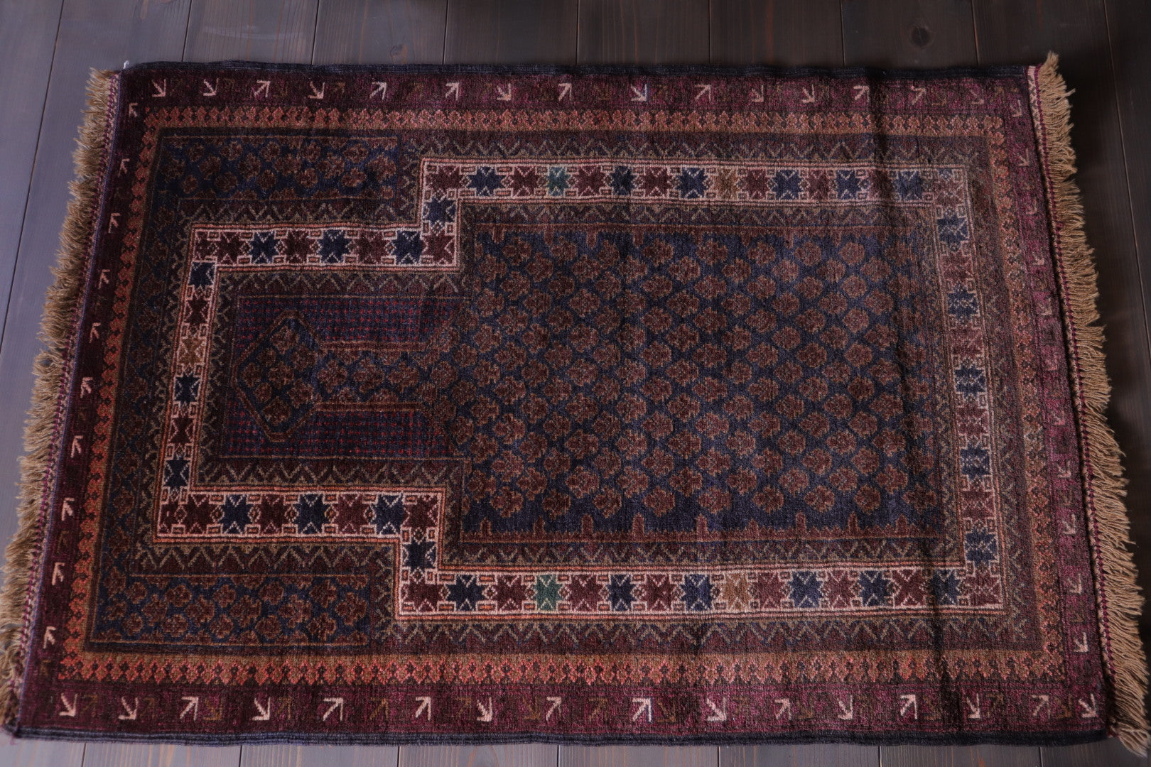 中央に祈りの方向を示すアーチ型の「ミフラーブ」デザインが織り込まれた祈祷用ラグ。 状態もよく、ソファ前やベッドサイドにオススメの一枚です。