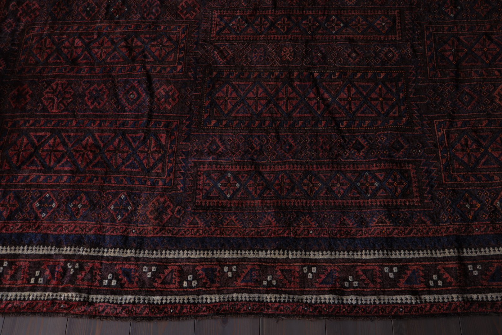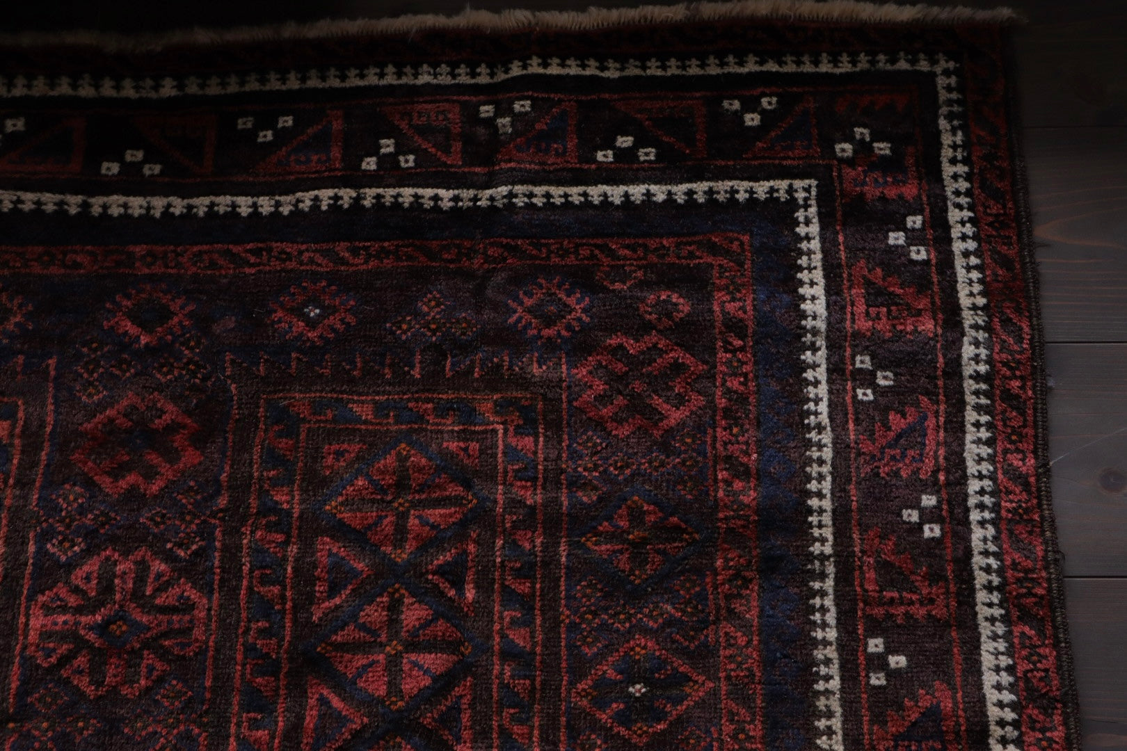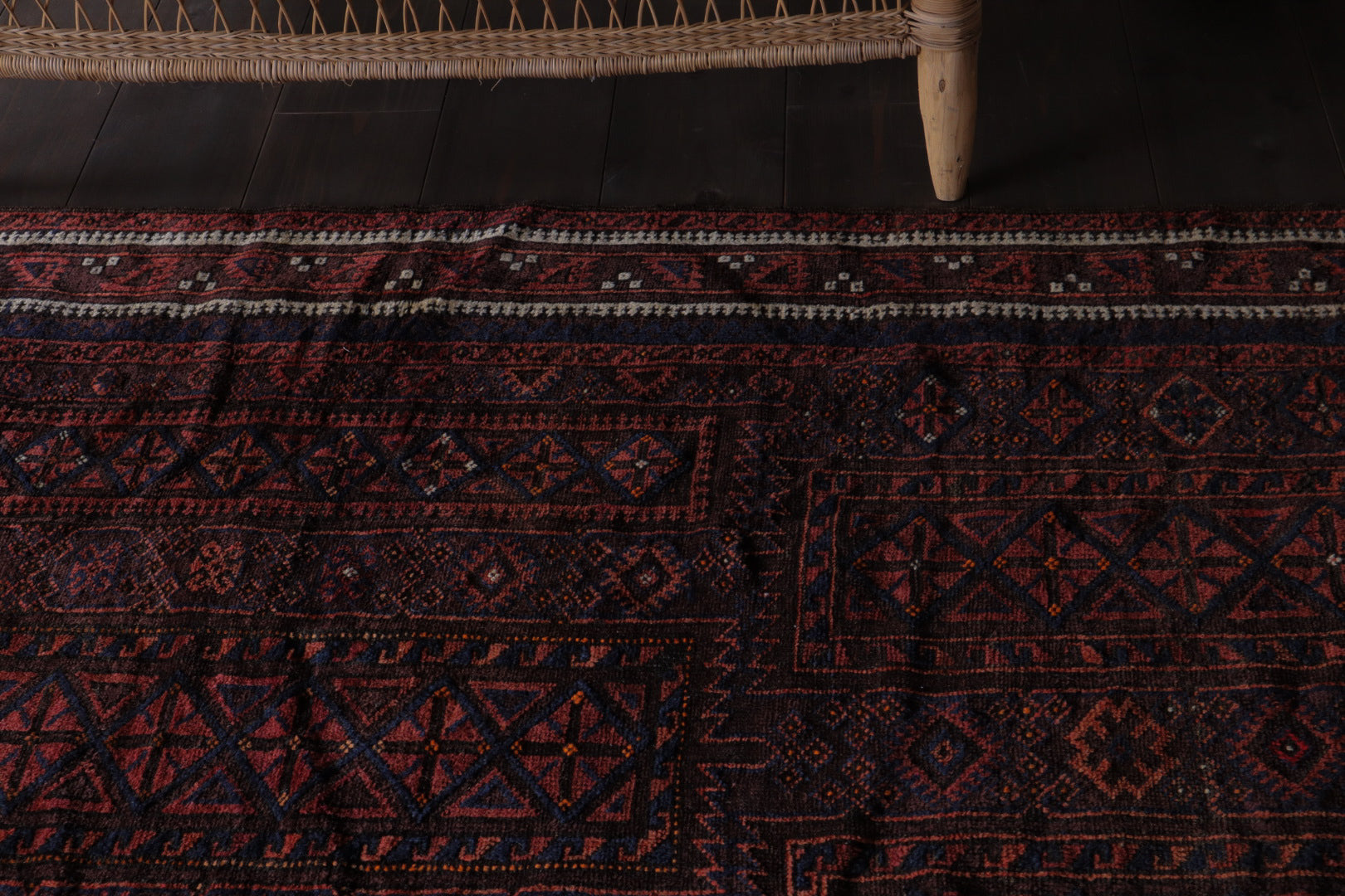 アフガニスタン西部〜イラン東部周辺に暮らすバルーチ族によって織られたヴィンテージラグ。 縁取りには白糸を使ったアクセントが入っており、全体の構図を引き締めています。草木染めならではの柔らかな柔らかさと経年による艶が魅力。
