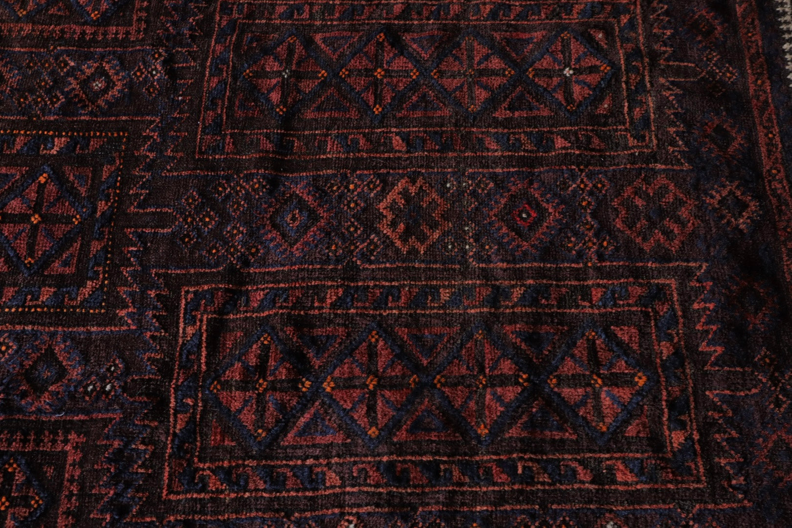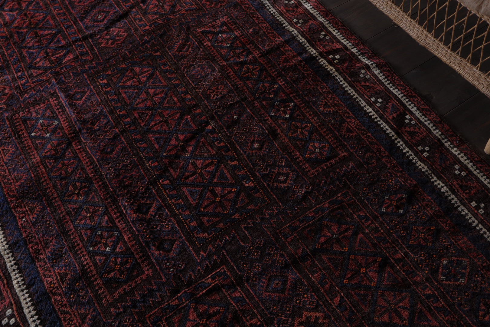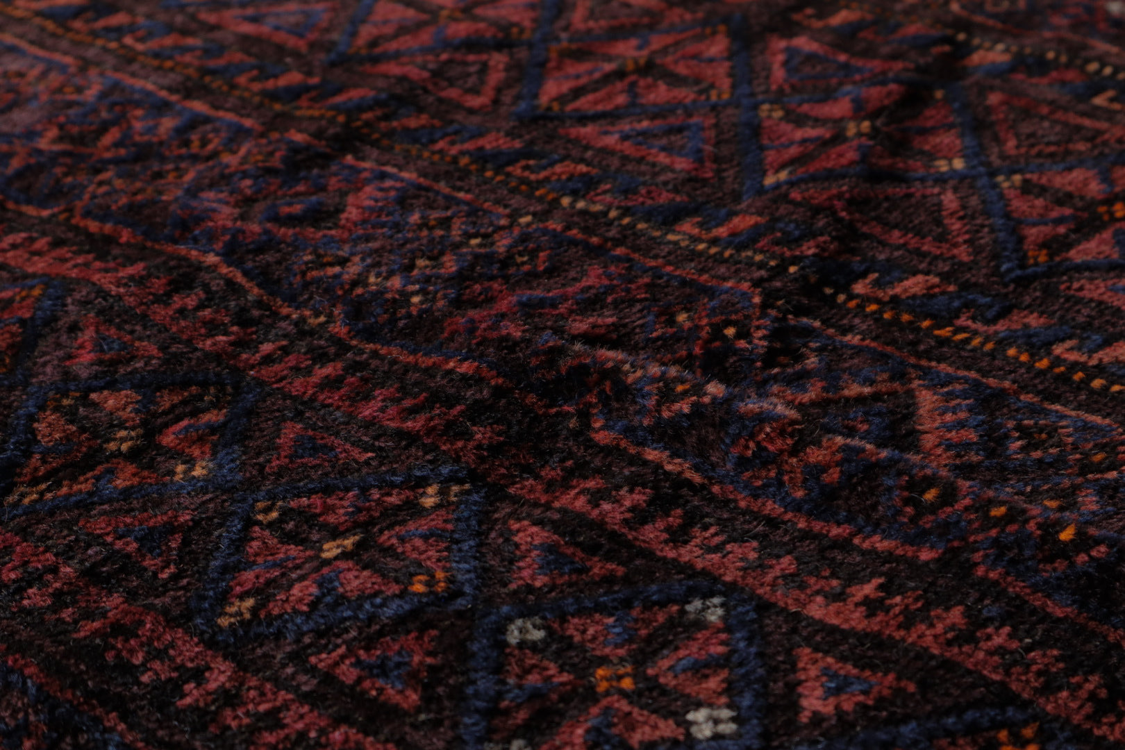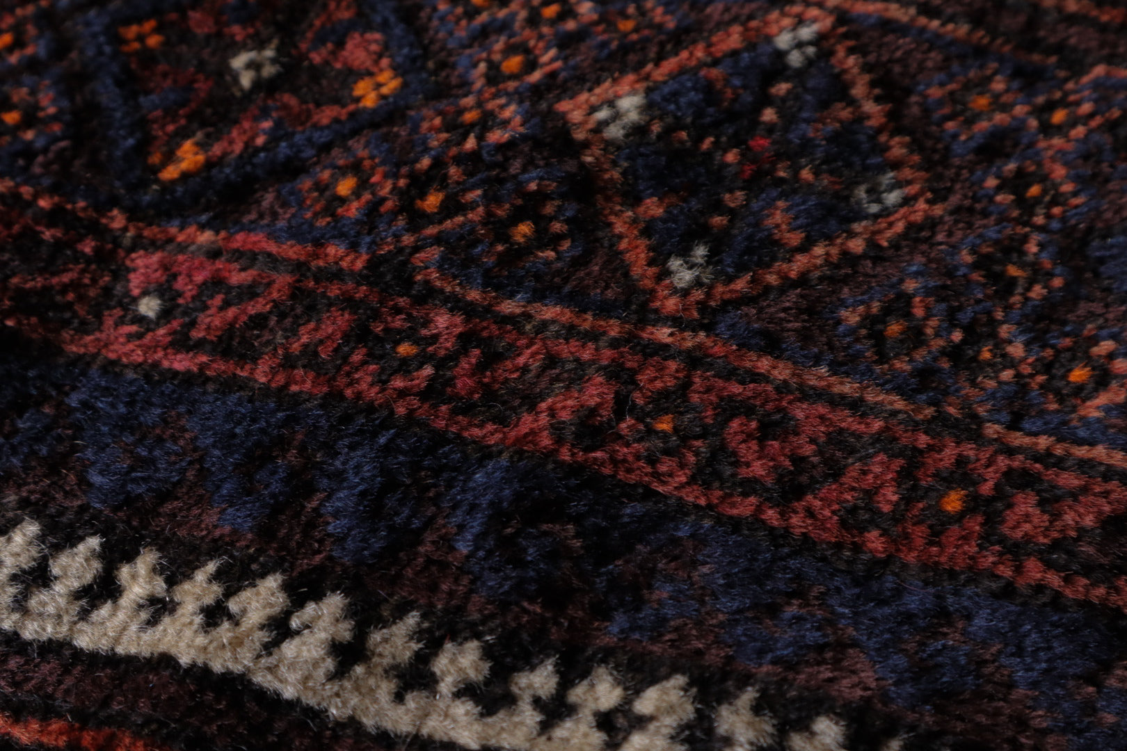 アフガニスタン西部〜イラン東部周辺に暮らすバルーチ族によって織られたヴィンテージラグ。 縁取りには白糸を使ったアクセントが入っており、全体の構図を引き締めています。草木染めならではの柔らかな柔らかさと経年による艶が魅力。