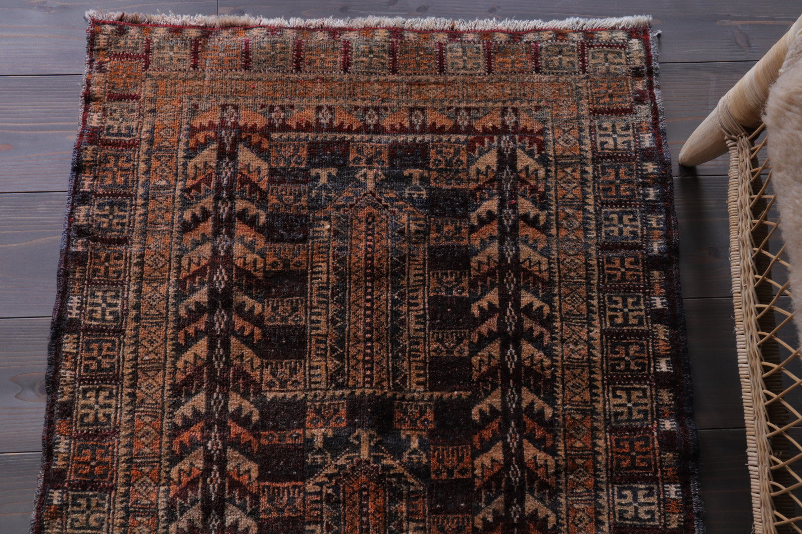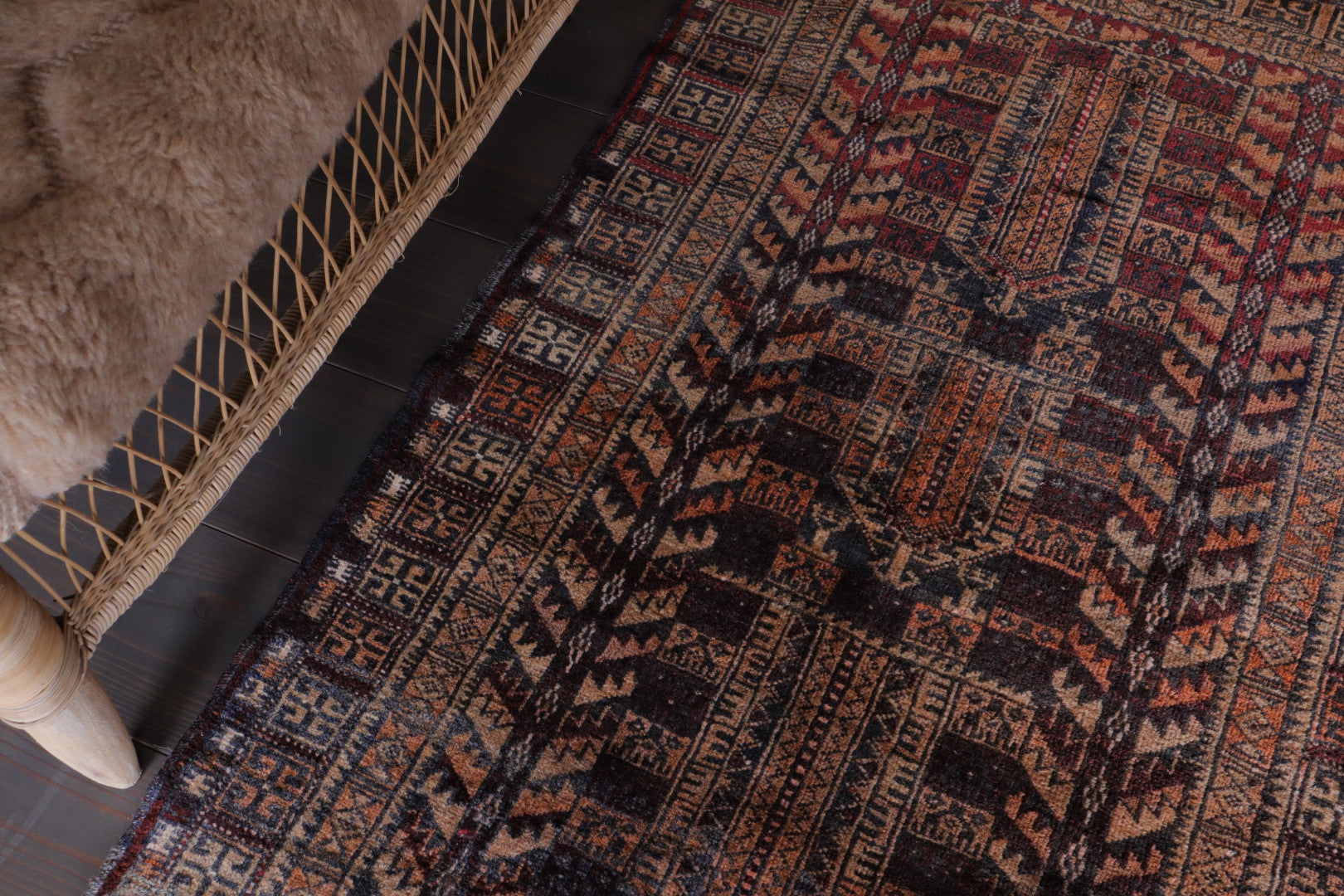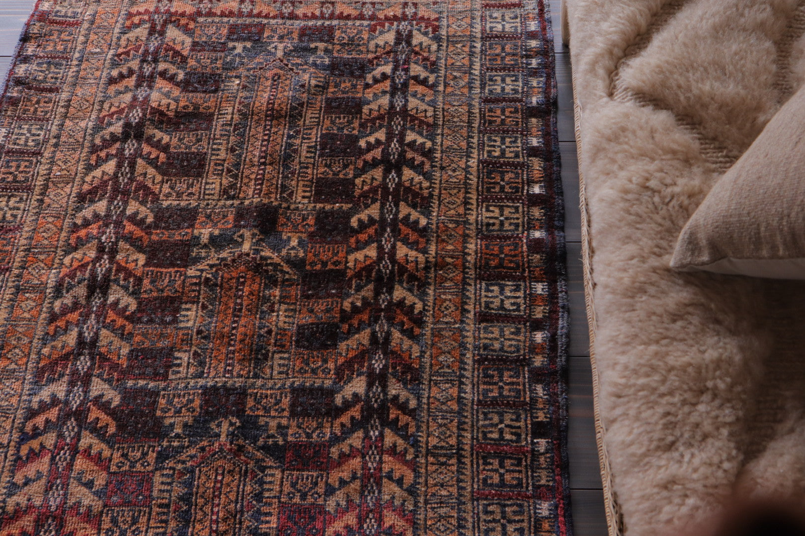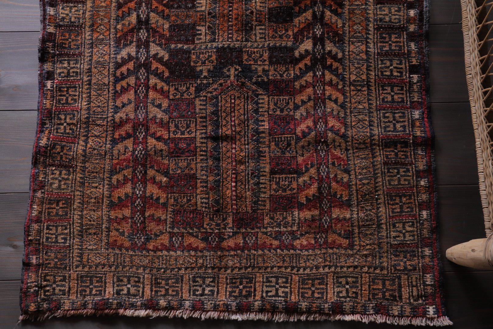 こちらは、ミフラーブ(礼拝用アーチ)モチーフを3つ並べた、祈祷用のプレイヤーラグです。家族や集団での祈り、または装飾性の高いラグとして織られたと考えられます。 幾何学文様の外枠(ボーダー)には、魔除けや祈りの意味合いが込められています。 色使いは、赤茶・焦茶・黒・ベージュ・オレンジを置いて、力も強く温もりある印象です。