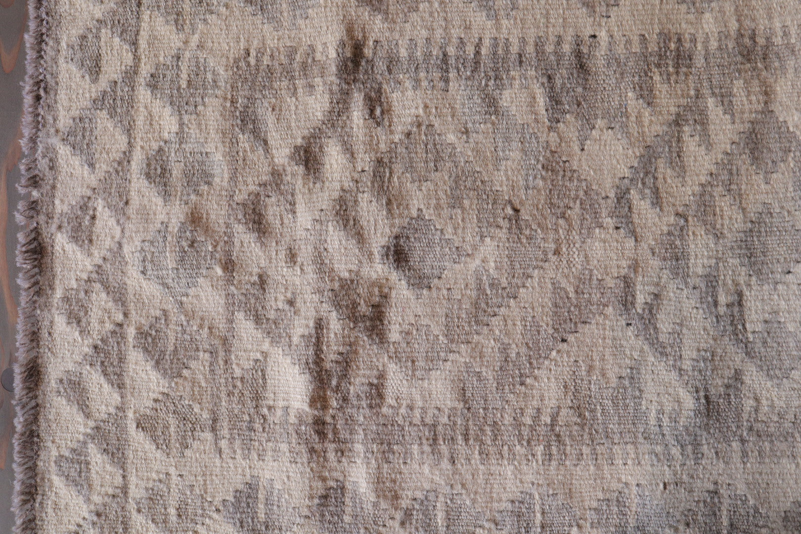 無染色の羊毛で織り上げられた、幾何学模様のハンドメイドラグ。平織りのざっくりとした表情が特徴です。静かな砂漠の風景を思わせるような、淡いベージュとグレーのコントラスト。落ち着いたカラーリングは、モダンな空間からナチュラルインテリアまで幅広く調和します。裏表なくご使用いただけます。