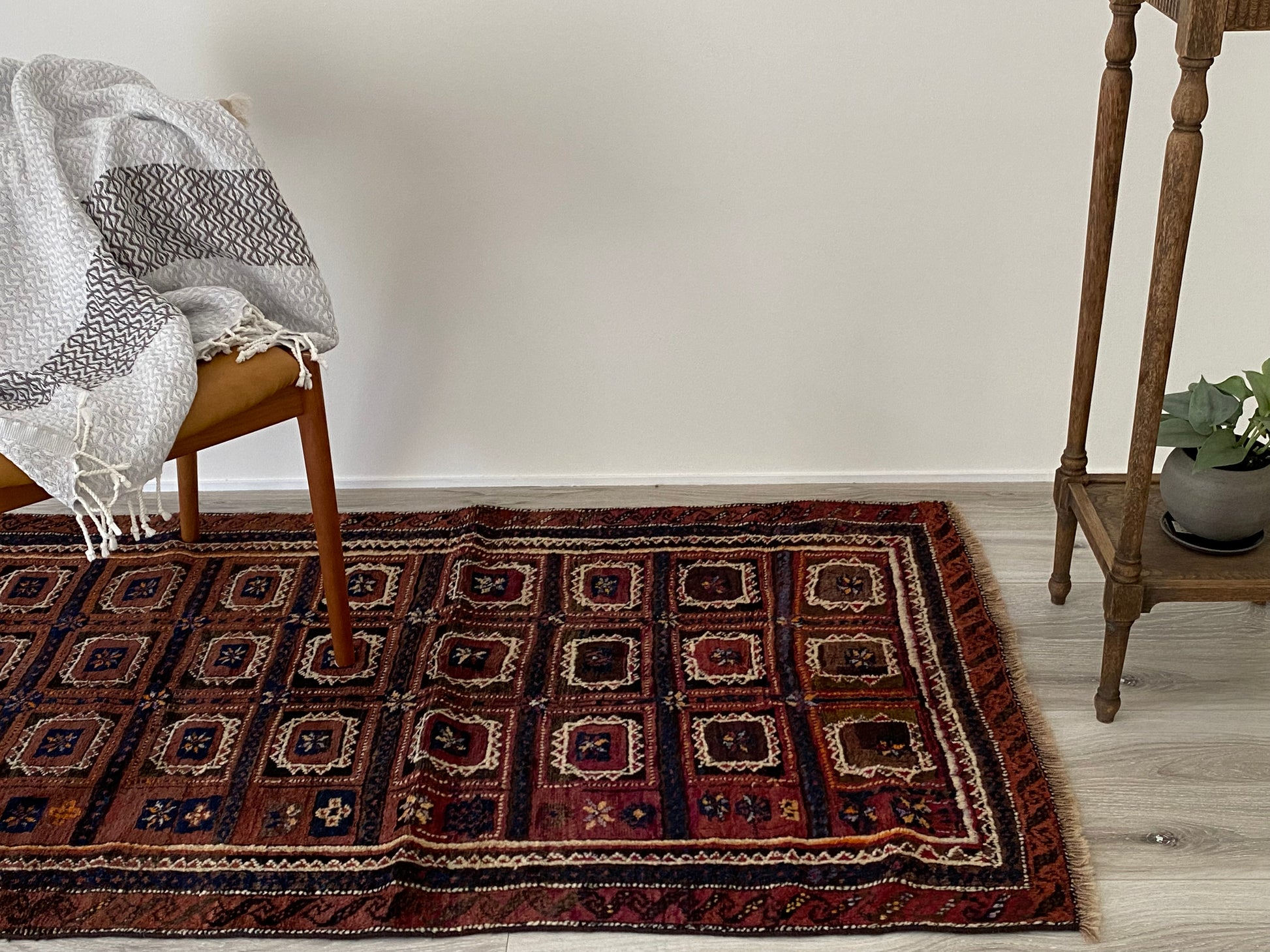 とにかく可愛すぎるデザイン。規則正しくモチーフを織り込んでいるようで、ゆるゆるなデザインが魅力的です。織り手の自由な感覚のままに織り込んだデザインが素敵なんです。そして、渋さと品のあるワインレッドの色も魅力的です。柔らかなパイルも含めて、このラグの上で心も体も緩んでほしい一枚です。