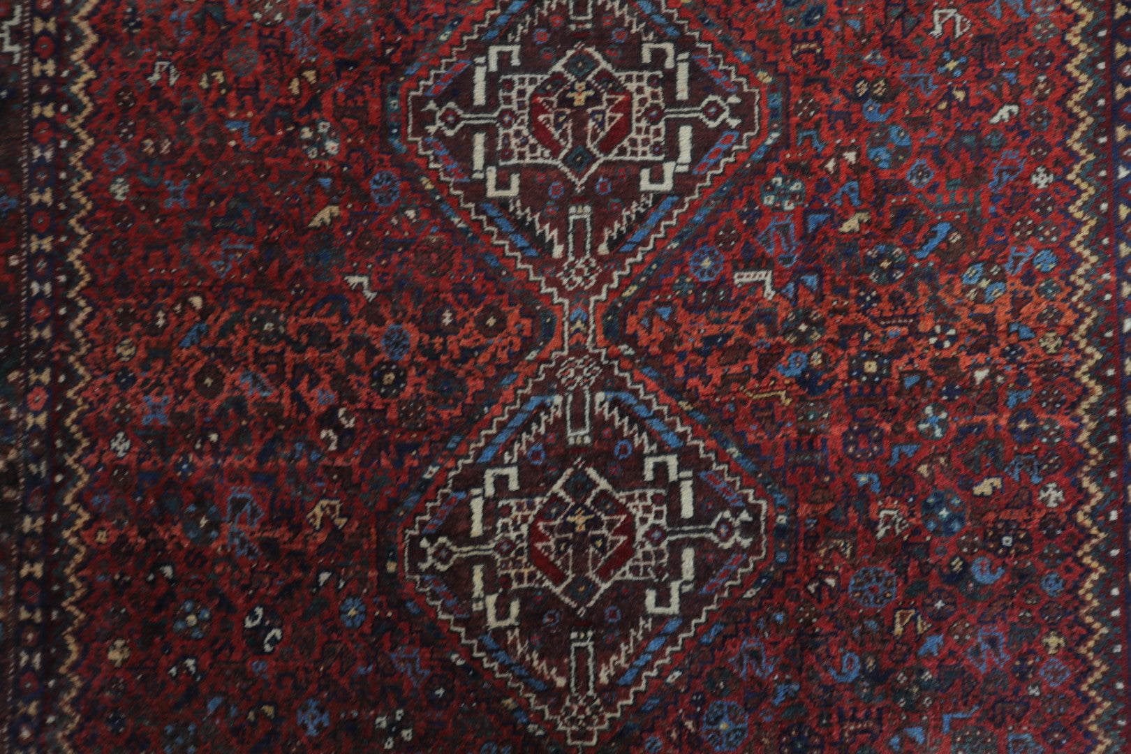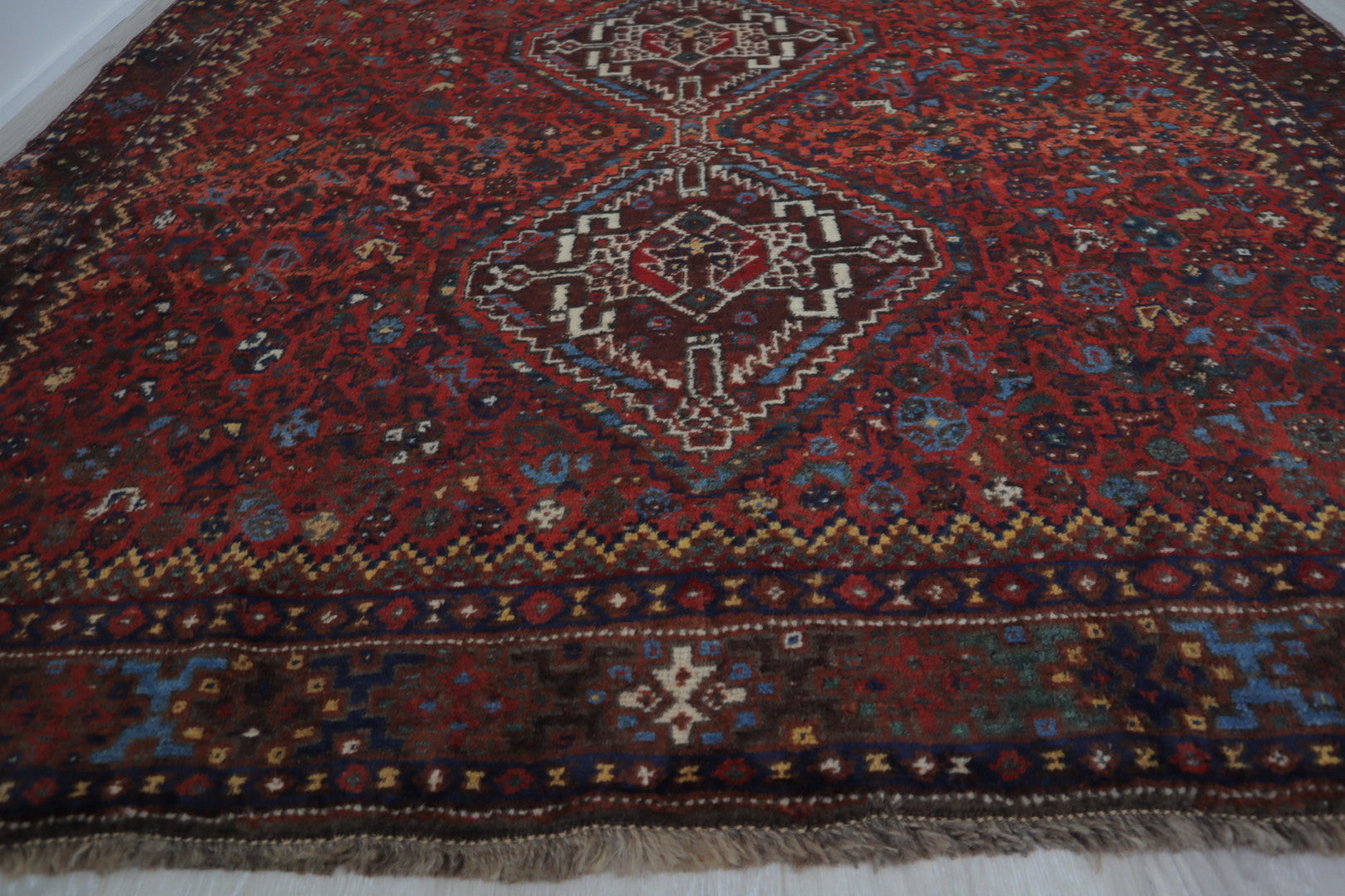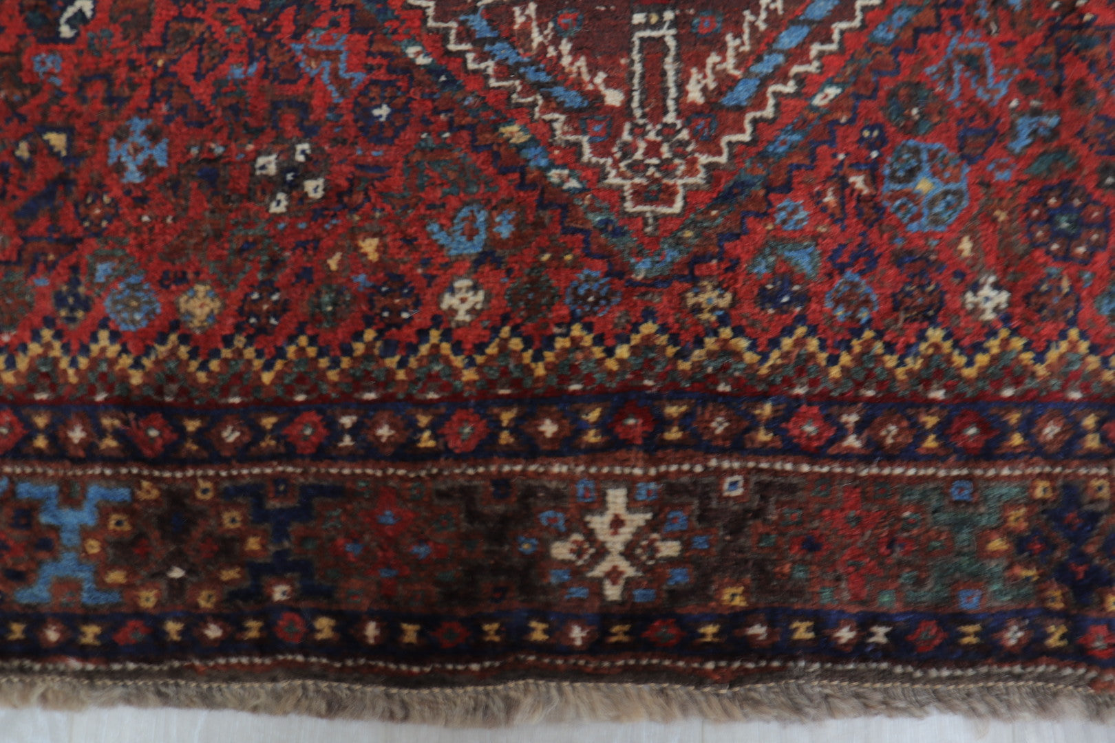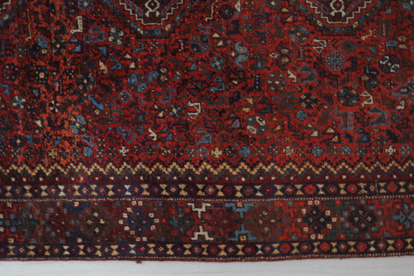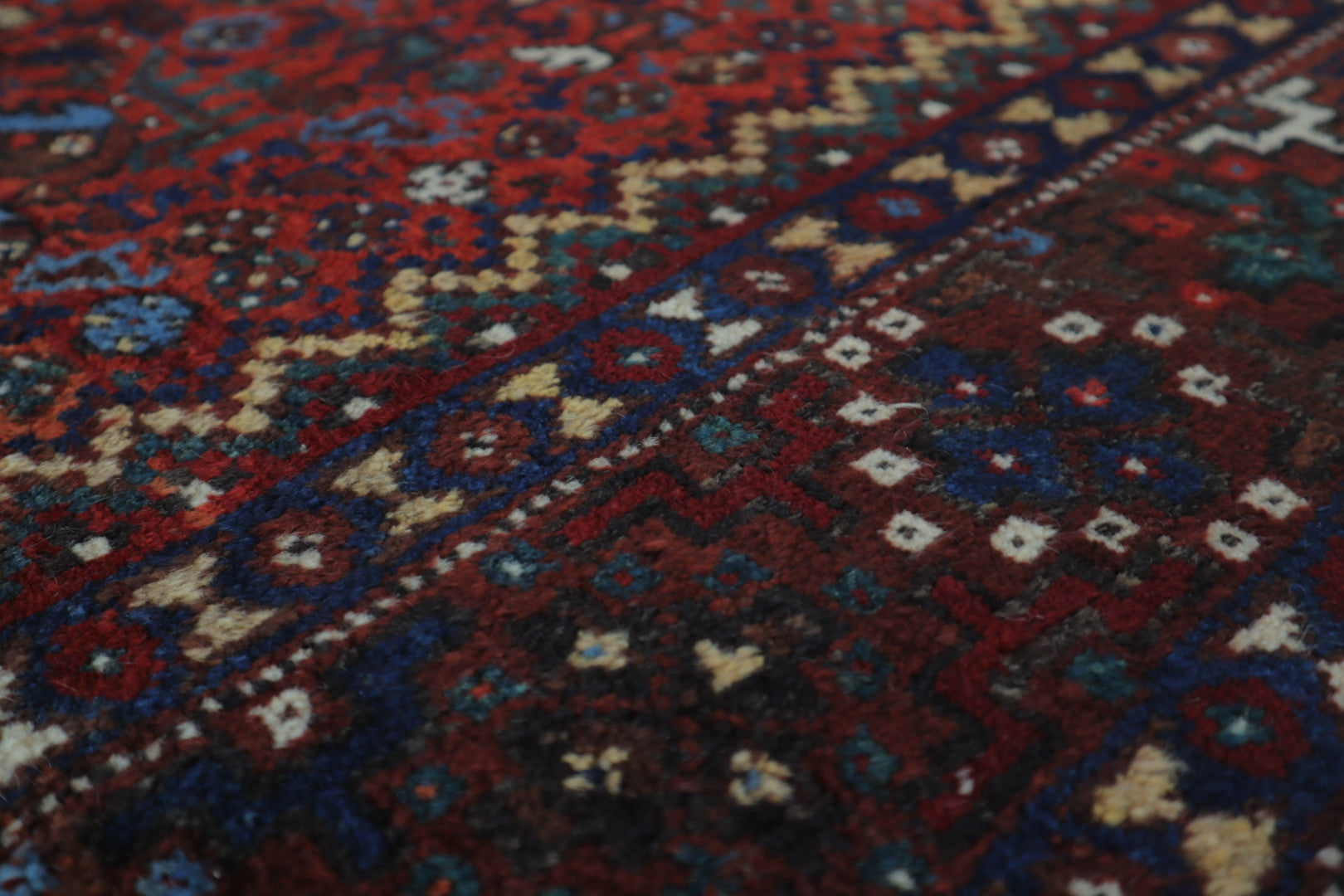 美しくてカッコ良い3つのメダリオン。(画像の白色のカラーが実際は落ちついた生成りになります。)その周りは、鳥や草花のモチーフが賑やかにギュギュッと詰め込まれ、まさに宝箱をひっくり返したような印象とはこのことだと思いました。ベースカラーが落ち着いたワインレッドなので、全体的には落ち着いた雰囲気を醸し出しています。